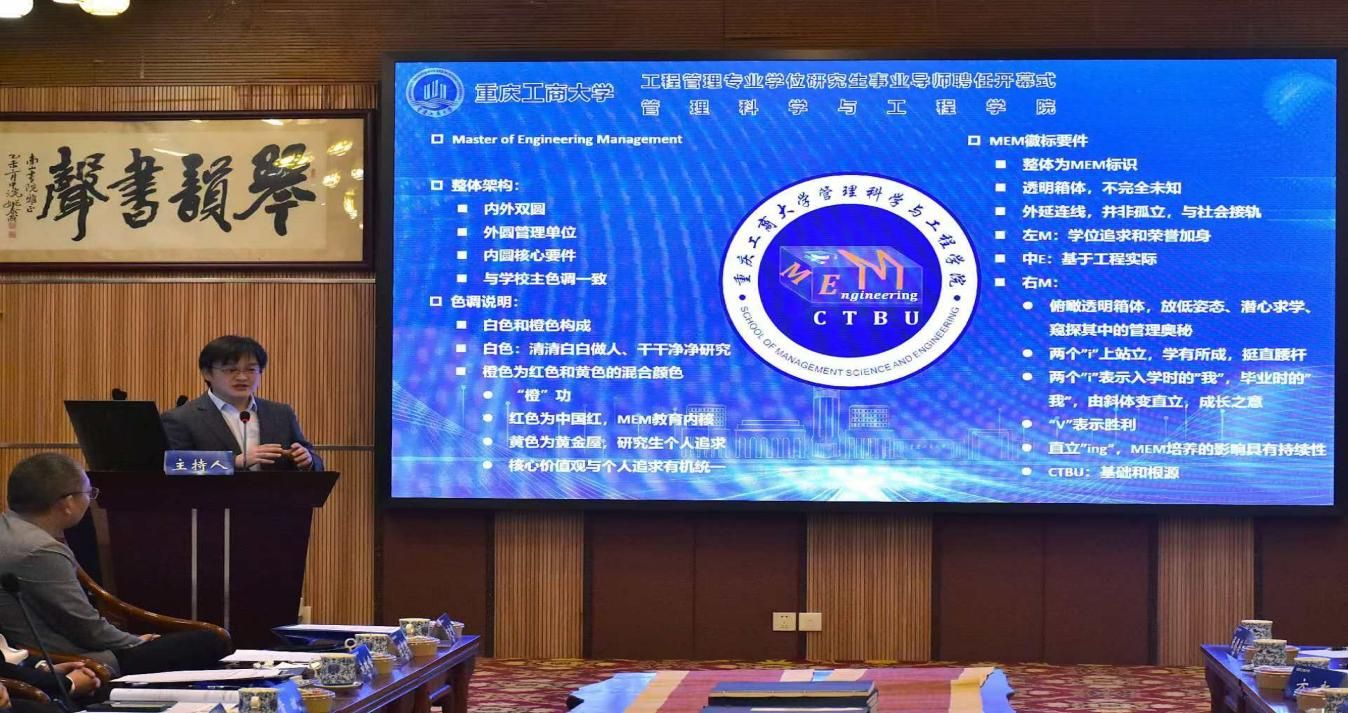 重庆工商大学MEM中心主任方新教授对工程管理专业研究生徽标的含义进行讲解,方主任指出MEM是工程管理硕士的英文缩写并详细地介绍徽标图形的核心构件,随后方主任对校徽中各个要件所蕴含的深层次含义进行了详细介绍。