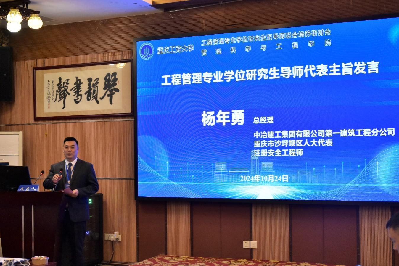 中治建工集团有限公司第一建筑工程分公司总经理杨年勇作为导师代表发言。杨总经理首先回顾了自己在重庆工商大学难忘的学习经历,表示自己作为事业导师再次回到母校,需要注重将理论与实践相结合,培养学生的创新能力,加强团队合作精神,以及注重职业道德和社会责任感的培养。杨总经理期待通过共同努力,为学院培养更多优秀人才,并相信重庆工商大学工程管理专业将取得更辉煌的成就。