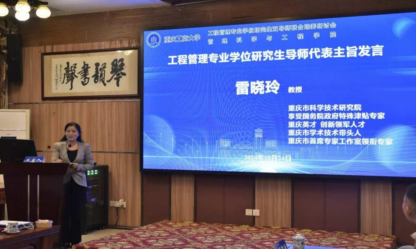 重庆市科学技术研究院首席专家雷晓玲作为导师代表发言。雷首席首先分享了“三高三新一实”的参会感受,即:“站位高、标准高、效率高”“学院新、专业新、导师新”“工作实”,并表示将全力以赴为专业硕士研究生的培养贡献力量。随后雷首席提到了学院的双导师体系,包括学业导师和事业导师,这种双导师制度体现了教育模式的创新。最后,雷首席提到了学院的务实工作态度,从筹备到实施,每一个细节都凝聚了团队的努力。雷首席表示将全力以赴,为专业硕士研究生的培养贡献力量。