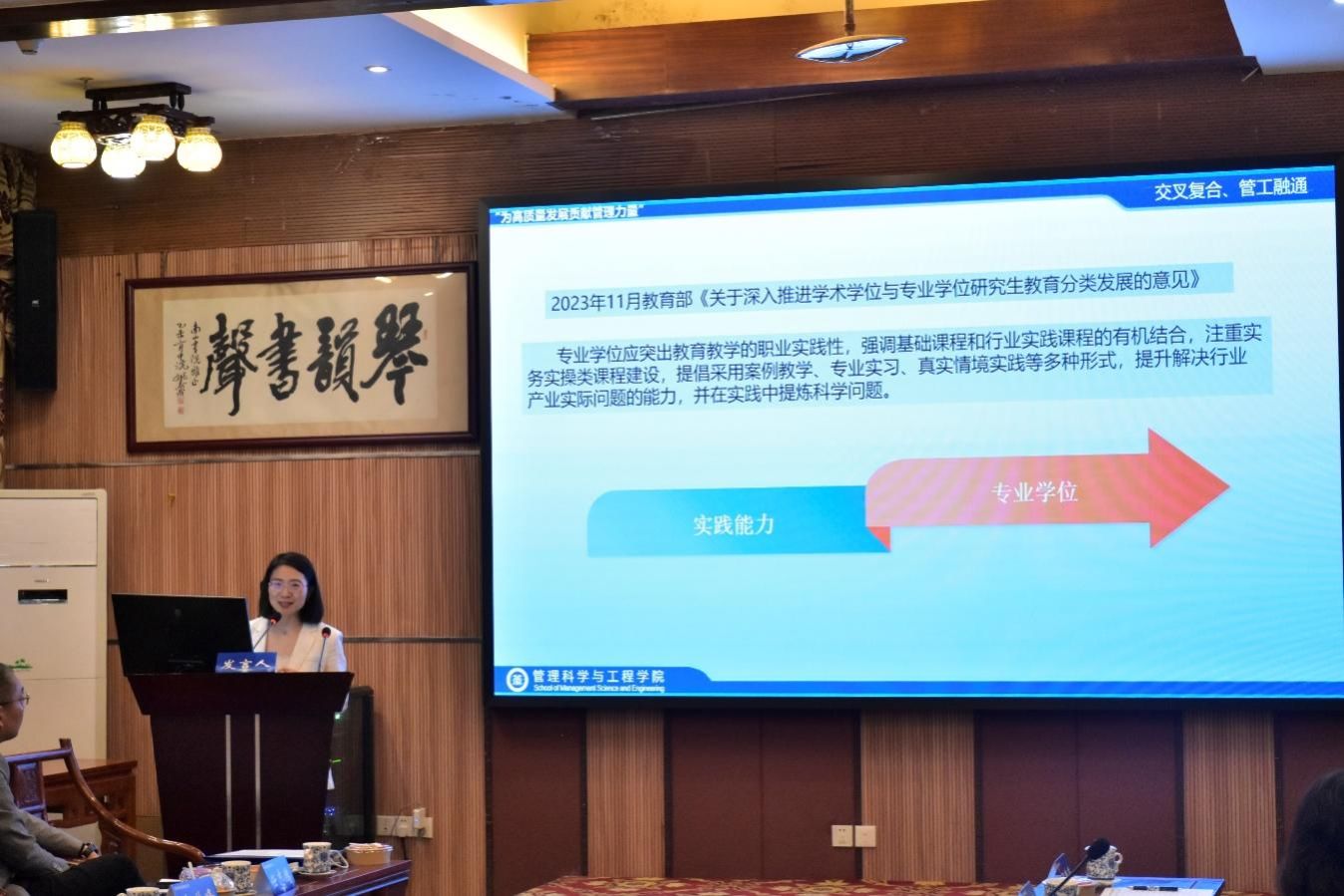 太阳成tyc7111cc黄钟仪院长向与会嘉宾做了“校地企”协同培养人才模式报告。黄院长首先介绍了学院“交叉复合、管工融通”的发展方针,旨在通过跨学科融合培养高素质管理人才。接着重点介绍了工程管理专业学位培养方向包括项目管理和物流工程与管理,覆盖了从传统管理到新兴管理各领域,致力于培养适应未来挑战的管理人才,为社会经济高质量发展贡献力量。