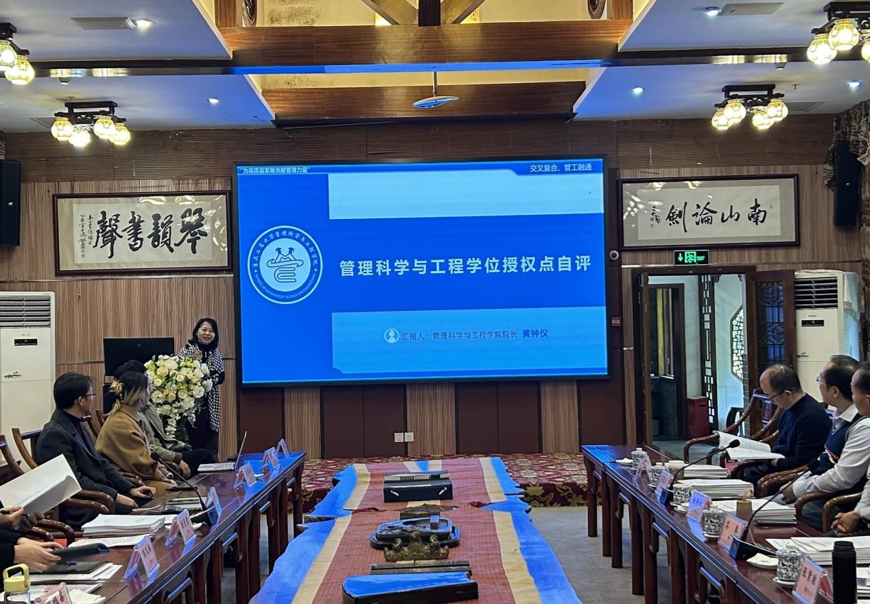 会议第二阶段,首先由黄钟仪院长汇报管理科学与工程硕士学位点的建设情况,包括学科方向、师资队伍、人才培养、服务贡献等情况,以及建设过程中面临的问题和未来的改进策略。