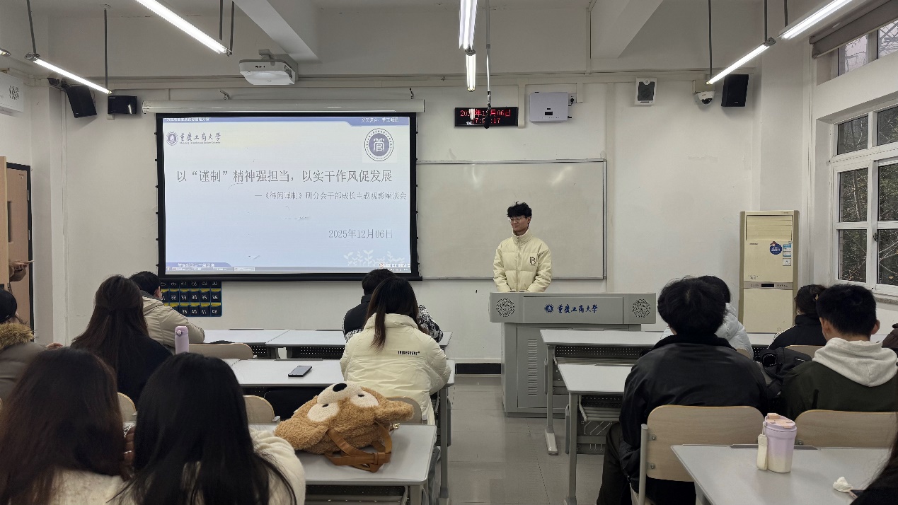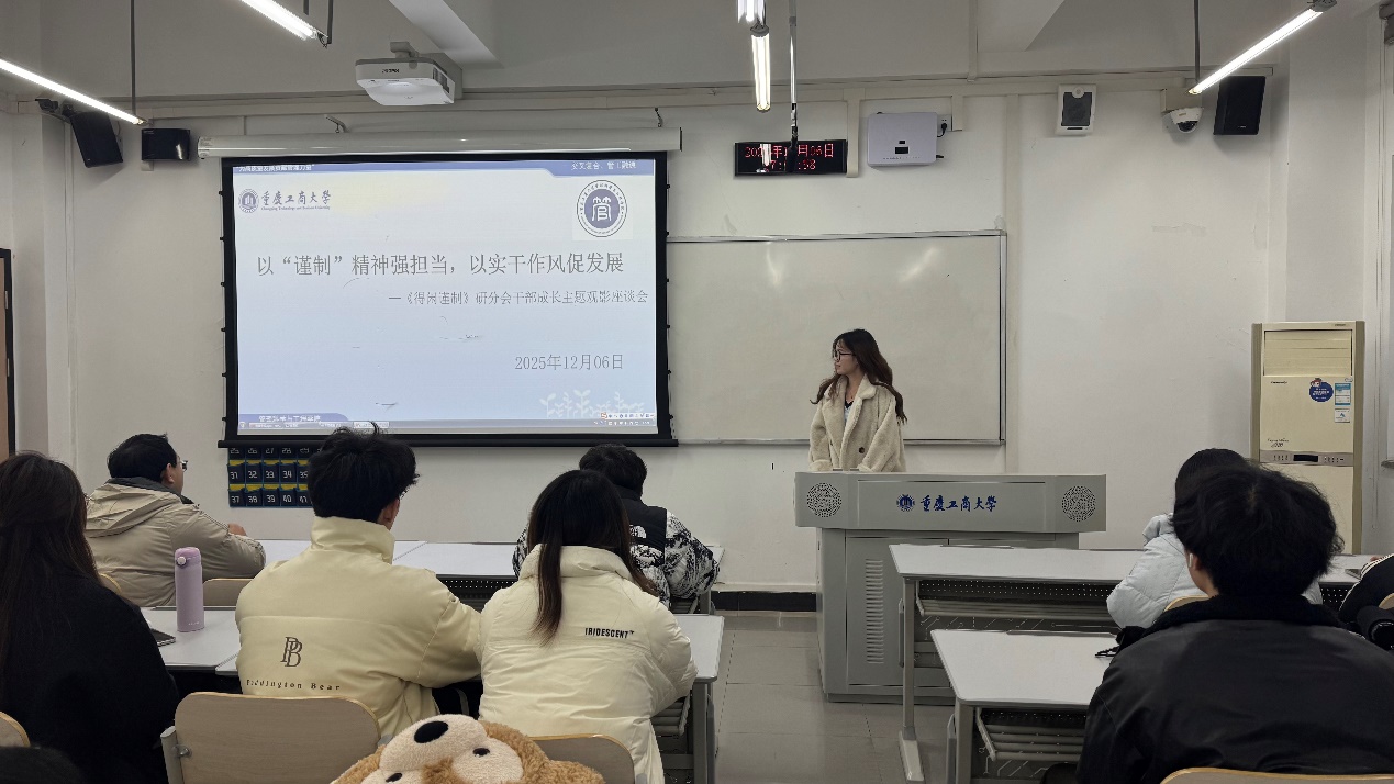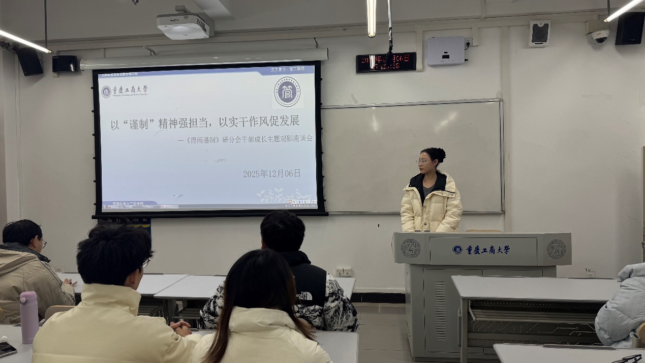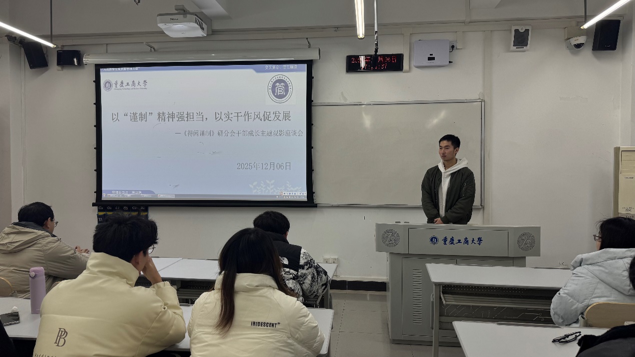 观后感交流环节在明智楼110417教室开展。宣传部部长刘文担任主持人并抛出“影片中哪一情节最能体现‘谨制’精神”、“‘严真细实快’的工作作风如何具象化”等问题,以激发研分会成员的表达热情。