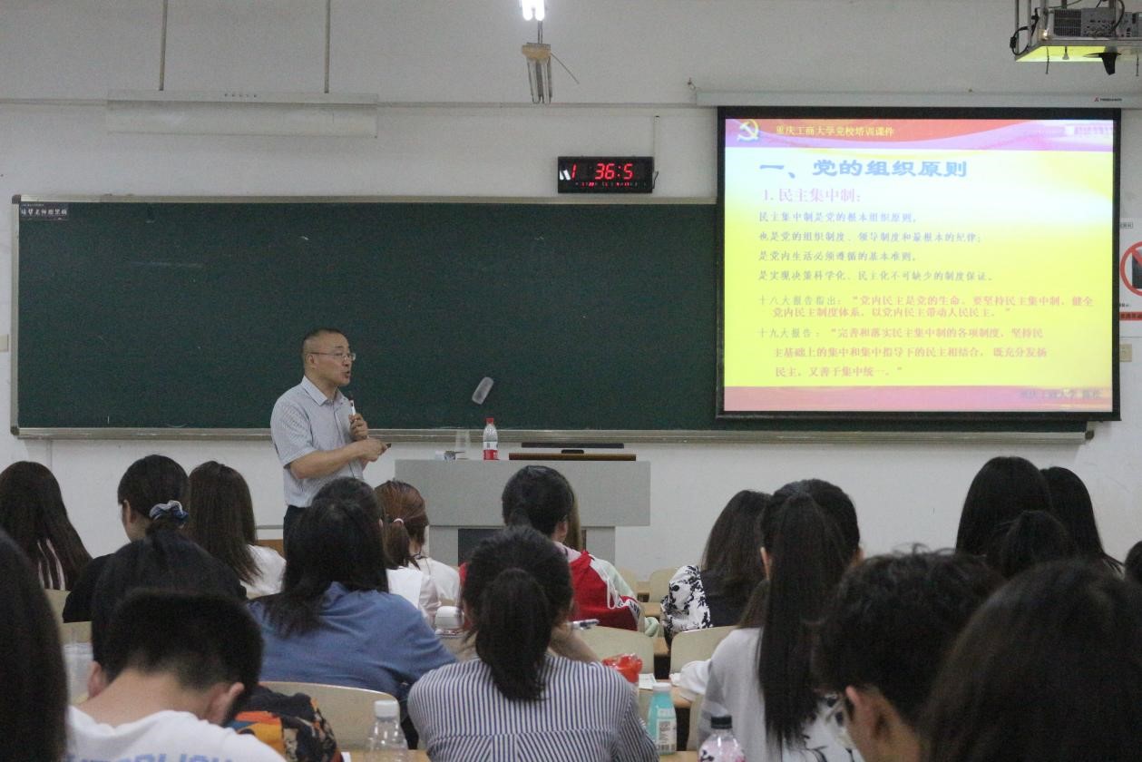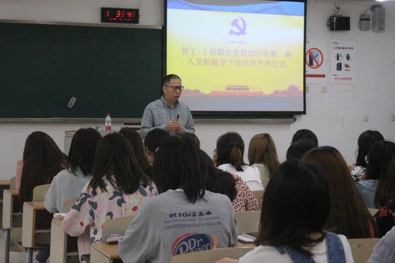 为了教育引导广大入党积极分子学习党的基本知识,了解党的基本路线和基本纲领,大力发扬红色传统、传承红色基因,以积极昂扬姿态迎接建党百年,2021年5月29日,由太阳成tyc7111cc和工商管理学院联合党校举办的2021年第一期入党积极分子培训班在博智楼07205教室正式开班。重庆工商大学党委统战部常务副部长陈松、太阳成tyc7111cc分党委书记邓德敏、太阳成tyc7111cc专职组织员叶海林参加了本次开班仪式并进行授课,80余名入党积极分子参加了此次培训。
