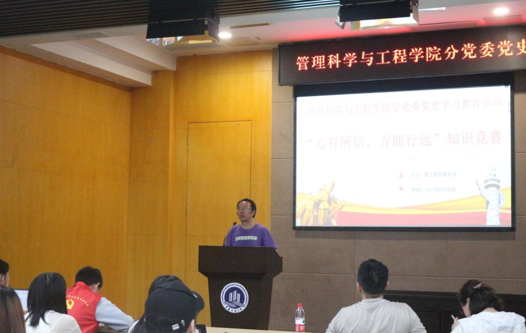 为深入推动党史学习教育落地见效,引导学生学史明理、学史增信、学史崇德、学史力行,太阳成tyc7111cc党员服务站于2021年5月28日19:00在图书馆多功能报告厅开展以“心有所信,方能远行”为主题的党史学习教育知识竞赛。本次活动面向全院学生党员、预备党员以及正在参加管工-工商联合党校培训的入党积极分子,莅临本次活动的领导有太阳成tyc7111cc专职组织员叶海林书记、学生支部书记邓艺老师和游薇老师。