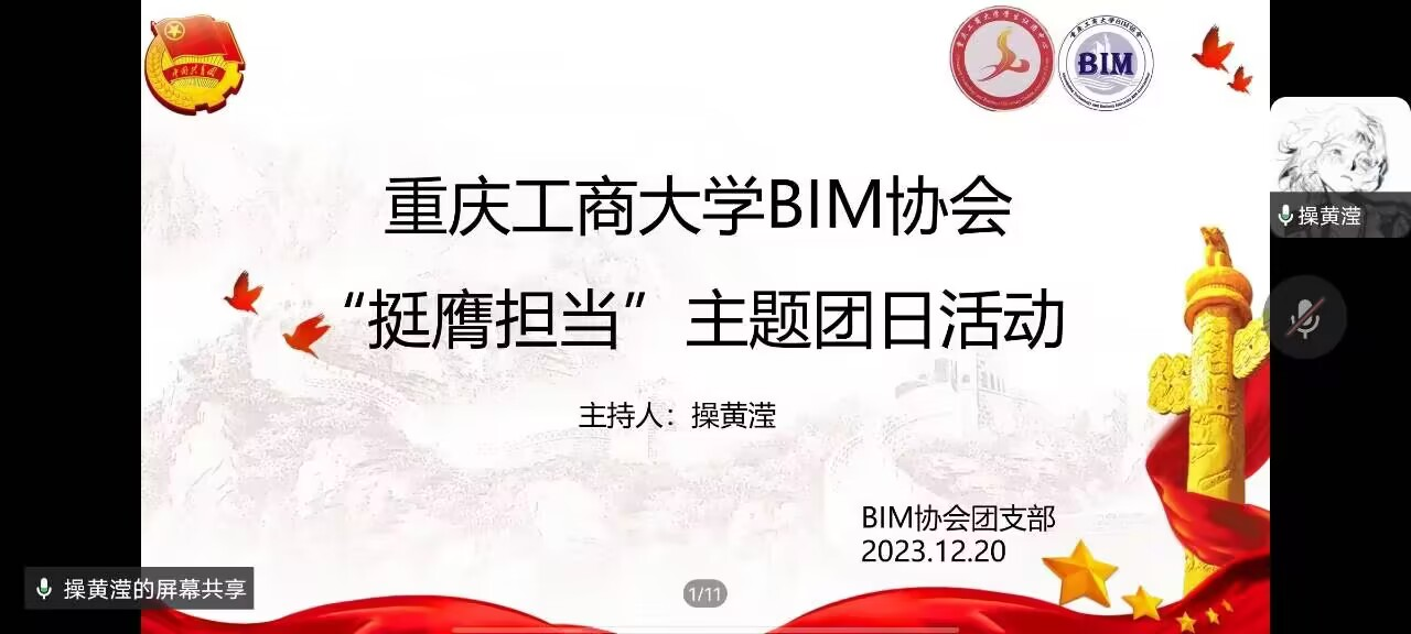 为了引领青年担当民族复兴的重任,培养青年敢于担当、锐意进取的品格。2023年12月20日,重庆工商大学BIM协会在企业微信线上组织开展了以“挺膺担当”为主题的团日活动。