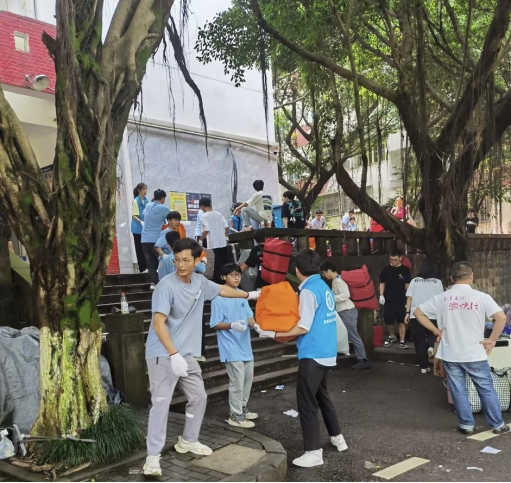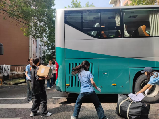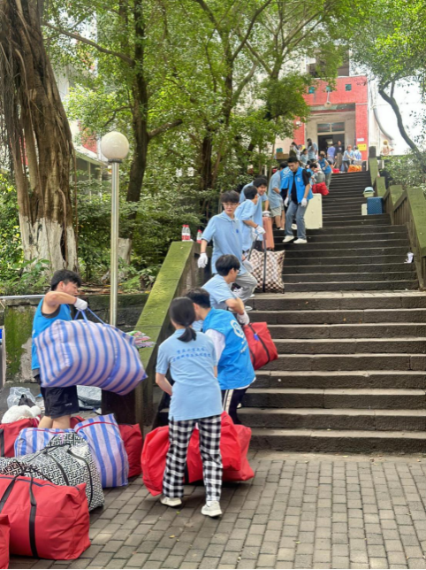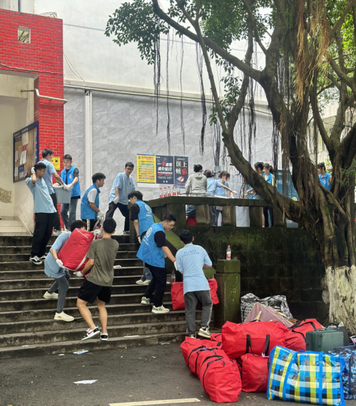 随着第一辆装满行李的班车抵达,南七的志愿者们采取“人浪”的方式与23级学生一起将行李搬运到寝室楼下,确保了搬运过程的顺畅和高效。其他楼栋的志愿者们也积极引导、组织和协助23级学生从卸车点到楼栋转运行李。