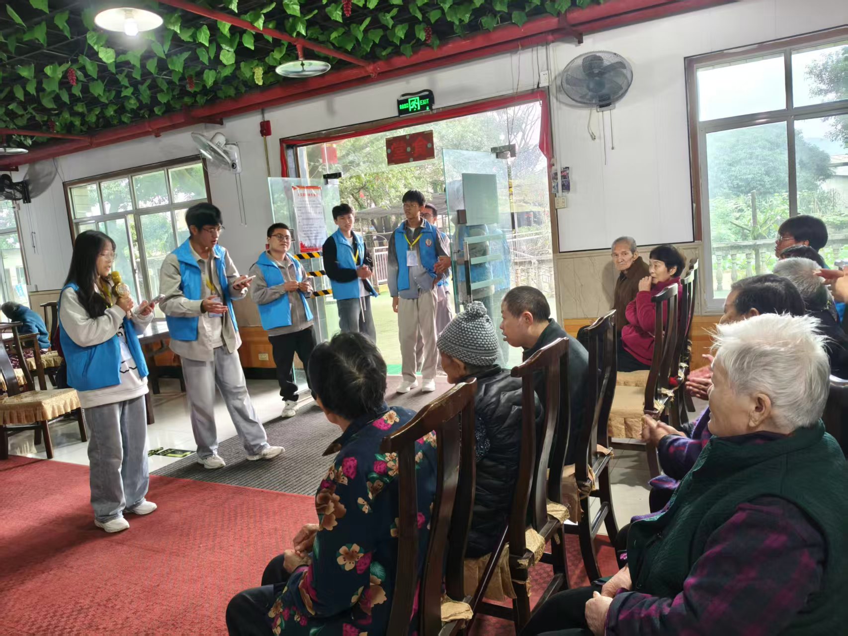 活动伊始,志愿者们怀着热忱的心意走进敬老院,亲切地和老人唠家常,志愿者们脸上洋溢的热情的笑容瞬间拉近了和老人们的距离,让本细雨蒙蒙的冰冷小院在一句句关心与问候中渐渐升温。随后,主持人用亲切的话语致开场词,一句句暖心的问候如同秋日暖阳,驱散了老人们心中的些许拘谨,也让志愿者们更快地融入了这个充满岁月故事的集体。