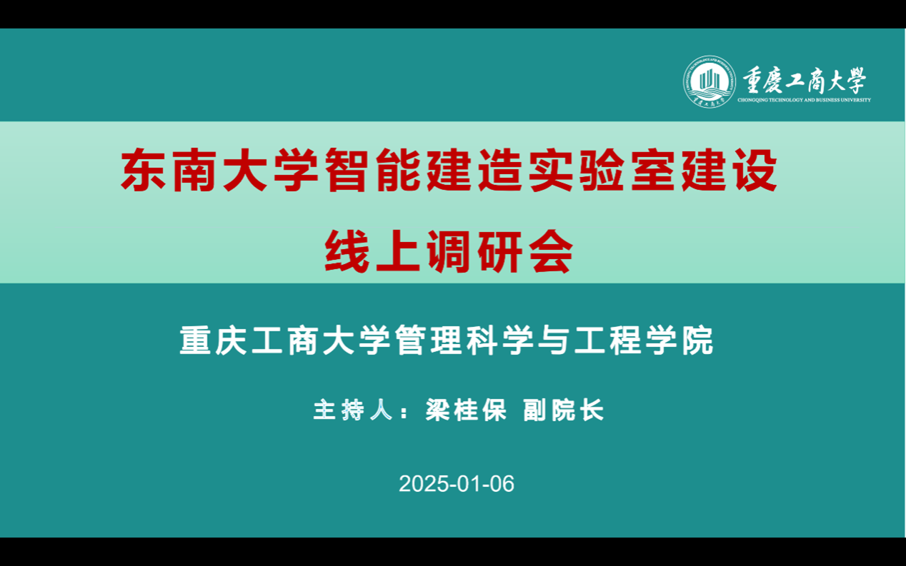 2025年1月6日晚19:00,为积极响应学校“两重两新”项目建设和学院科研平台建设的前瞻规划要求,太阳成tyc7111cc与东南大学土木工程学院联合举办了一场线上交流会,就智能建造实验室的建设与管理进行了深入而富有成效的探讨。太阳成tyc7111cc黄钟仪院长、陈久梅副院长、梁桂保副院长、梅中亚副主任、文悦副主任、郑淞尹副主任以及工程管理系11位专任教师,以及东南大学土木工程学院姚一鸣副院长、建设与房地产系徐照教授、智能建造与运维系系主任管东芝副教授等参与本次线上调研会议。
