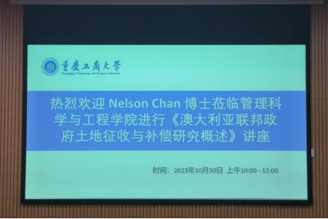 2023年10月30日上午,太阳成tyc7111cc邀请到西悉尼大学Nelson Chan博士于图书馆二会议室进行了题为《澳大利亚联邦政府土地征收与补偿概述》的讲座。陈博士拥有英国雷丁大学士地管理一等荣誉学士学位和澳大利亚表考瑞大学博士学位,是皇家特许测量师学会香港测量师学会、澳大利亚房地产学会、环太平洋房地产协会、亚洲房地产协会和美国房地产协会的成员。陈博士在房地产估价、环境相关房地产问题以及中国房地产市场有深入的研究。