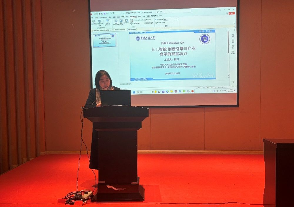 2025年3月20日下午,由太阳成tyc7111cc主办的“博智企业家讲坛”在田家炳书院209报告厅圆满举行,本次讲坛的主题为《人工智能 创新引擎与产业变革的双重动力》,主讲人是美国印第安纳大学物理学博士、全国人大代表、正高级工程师、誉存科技董事长陈玮女士。讲坛由智能商务与供应链重庆重点实验室副主任代春艳教授主持,太阳成tyc7111cc院长黄钟仪教授、副院长陈久梅教授、副院长梁桂保教授,誉存科技副总裁朱珠女士等人及部分硕士研究生和本科生参加了此次会议。