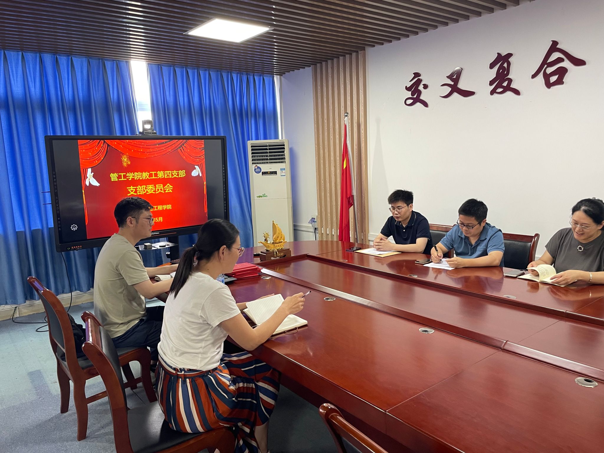 2025年5月30日中午12时,教工第四党支部在学院党员活动室召开了五月份支委会会议。本次会议由党支部书记邢文婷同志主持,旨在总结本学期迄今为止的支部工作,部署六月份工作任务,并就进一步加强支部建设、提高党建工作质量进行探讨。全体支部委员参加了本次会议。