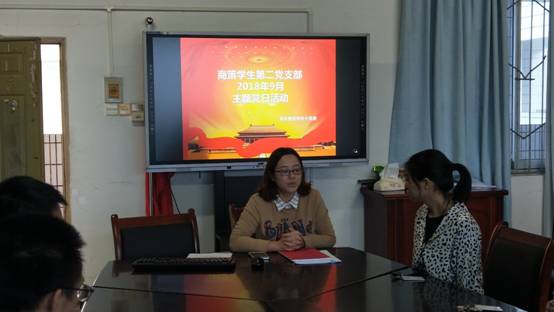 为深入贯彻习近平新时代中国特色社会主义思想和党的十九大精神,学生第二党支部于2018年9月27日14:00在明德楼4020举办了“商策学生第二党支部2018年9月主题党日活动”。此次活动由党支部书记游薇主持,分为党员同志近期思想汇报、组织思想学习以及党员同志讨论和发言三个部分。