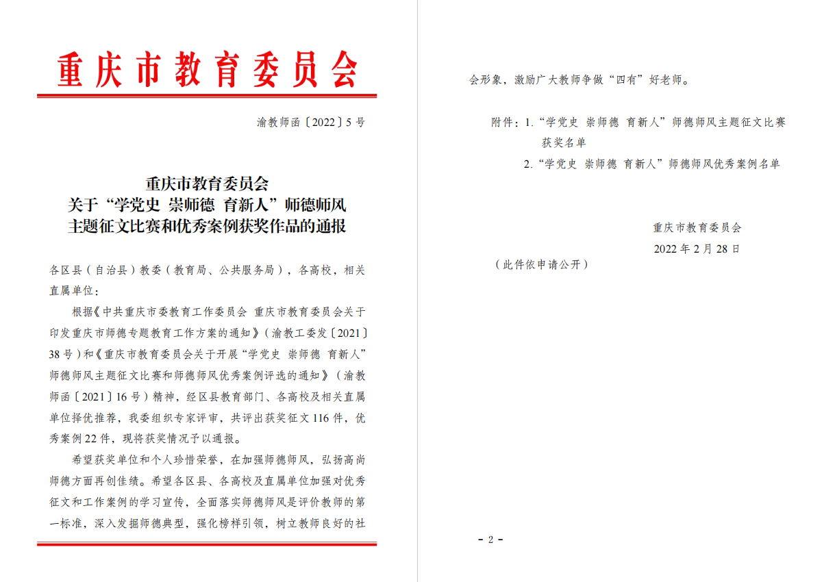 编者按:为深入学习贯彻习近平总书记关于教育的重要论述和“七一”重要讲话精神,市教委组织开展了2021年“学党史 崇师德 育新人”师德师风主题征文比赛和优秀师德师风案例评选,我院教师曾倩老师征文作品《万世师表》获二等奖。