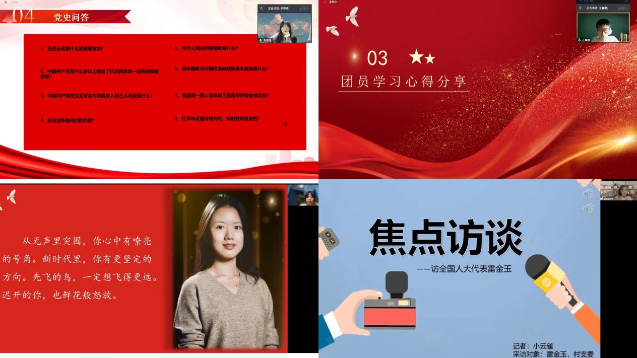 11月20日小云雀电子商务协会团支部通过线上形式举办“学习二十大,永远跟党走,奋进新征程”的主题团日活动。支部各成员在团支书的带领下,开展了共青团歌曲合唱,党的二十大视频学习,团员学习心得分享,党史问答、红歌竞猜,“青听青诉-中国故事”等系列活动。