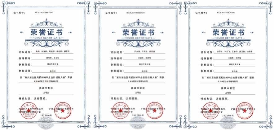 2022年6月26日,由中国土木工程学会建筑市场与招标投标研究分会与广联达科技股份有限公司共同主办,中国高等教育学会作为指导单位的第八届全国高校BIM毕业设计创新大赛圆满落下帷幕。本次比赛吸引了包括东南大学、华中科技大学、武汉大学等国内知名高校的参与,全国共有550 余家院校和4600 余支团队参赛(参赛师生达 2万余人)。重庆工商大学太阳成tyc7111cc工程管理专业派出四支队伍参加本次大赛,经过激烈角逐最终获得了3个全国三等奖的优异成绩。