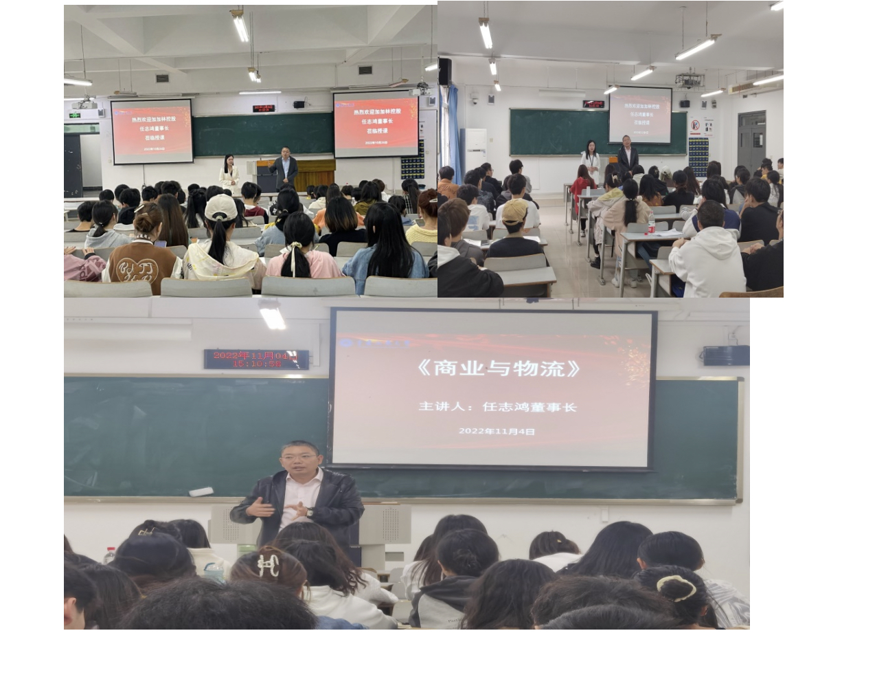 为更好地提高物流专业学生理论-实践-实战能力,2022年10月26日和11月4日下午,《物流经济地理》课程授课教师王燕教授特邀请加加林控股任志鸿董事长,结合公司发展为我院2021级物流管理专业1、2、3、4班学生讲授《商业与物流》课程。