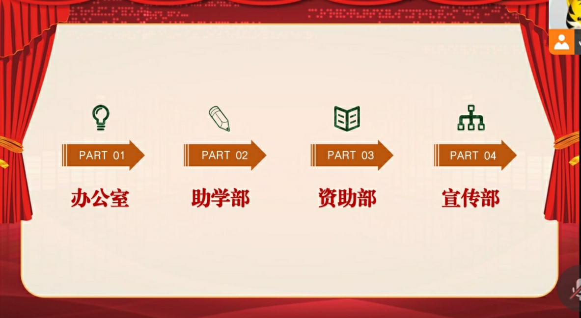 本次大会分为:主席代表致辞、优秀部长发言、优秀干事表彰、优秀干事代表发言四个环节。