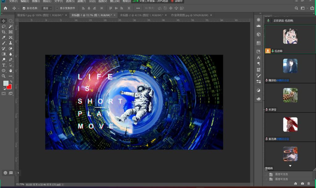 培训伊始,伍忠师部长首先通过几个示例介绍了此次培训所要用到的PS技术,如扭曲效果中的“极坐标”,滤镜“风”的各种效果,广角和调色效果以及渲染功能等。接着,伍忠师部长通过演示作业素材的制作将前面所提到的PS技术运用在具体的实例上,以便干事们更加深入的理解。