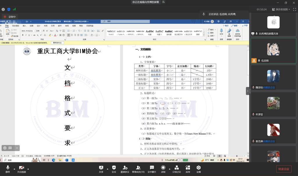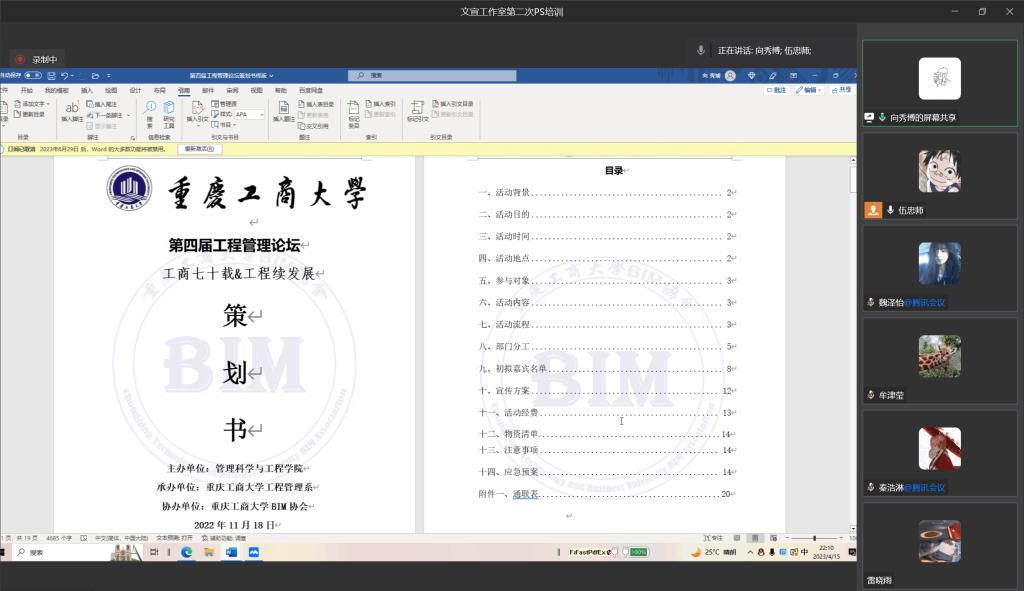 其次,由向秀博部长对策划书撰写进行培训,本次培训借用以往的策划作为参考,讲解了策划书目录中每一个标题的具体写作内容,如活动背景、活动目的、参与对象等,同时强调了BIM协会对策划书的文档要求:字体,行间距,标题等。