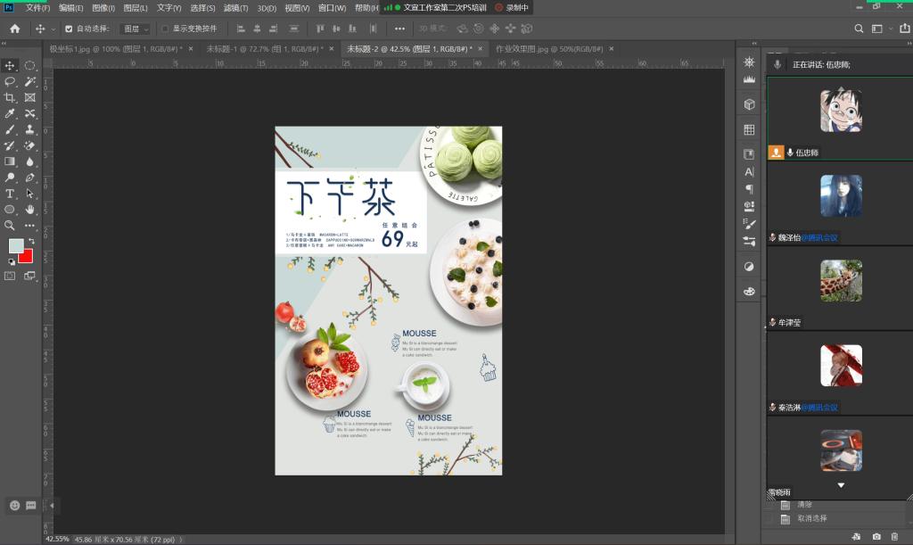 在PS技术培训的过程中,伍忠师部长在讲到抠图技巧时还穿插一些有趣的小技巧,以防止干事们学习枯燥。接着,伍忠师部长演示了海报“下午茶”的制作过程,详细地为干事们讲解了套索工具、边缘调整工具和抠图以及栅格化图层等功能。