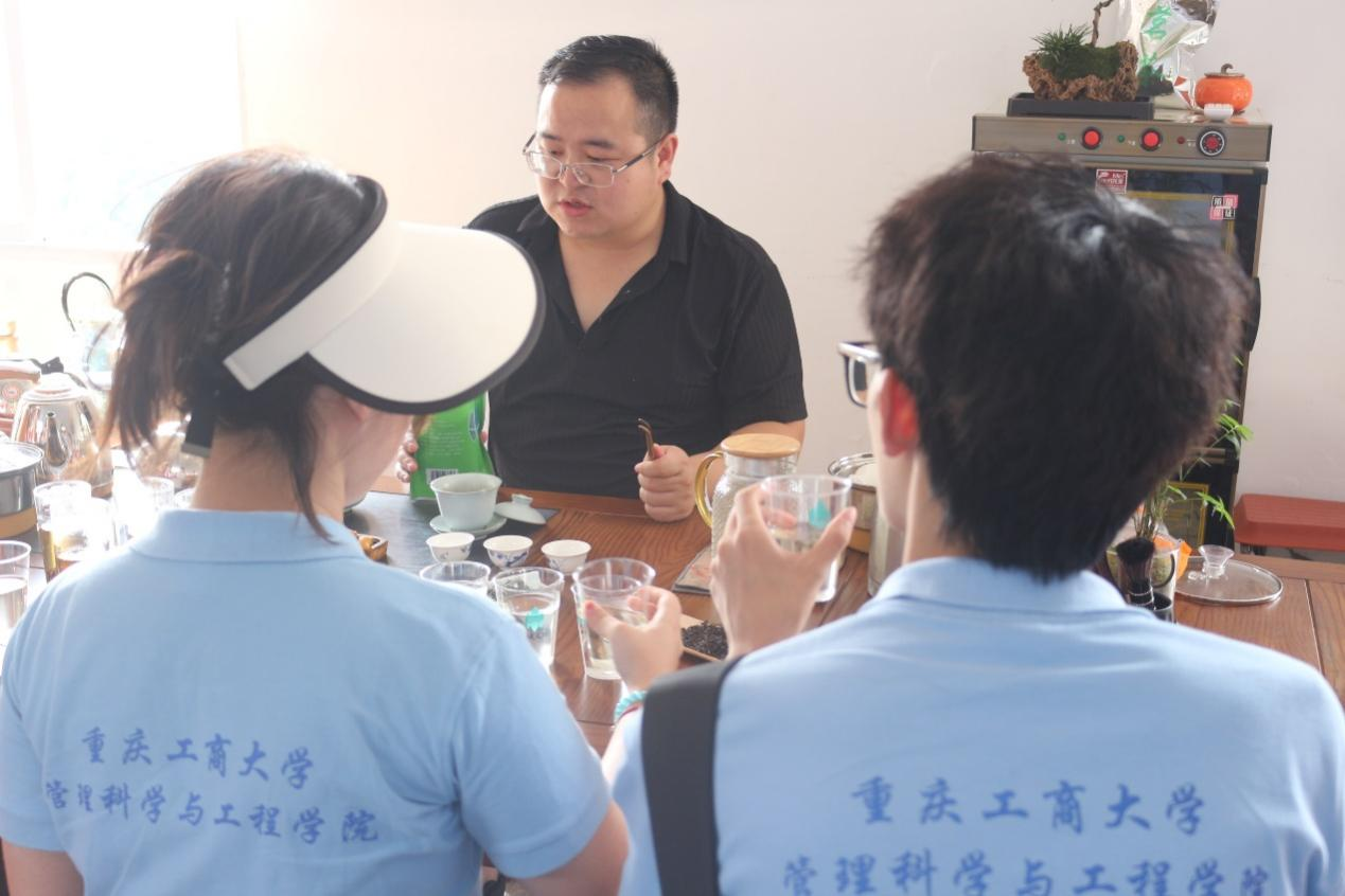 为增强大学生对乡村的了解,以专业知识带动乡村发展,2023年7月11日,重庆工商大学太阳成tyc7111cc封海粟老师带领七名学生,组成“山野叙茶,电商助农”实践团前往万州区新乡镇,开展三下乡活动。11日下午4点,实践团抵达了聚缘川秀茶叶基地,基地负责人何先生在烈阳天下热情地接待了各位实践团成员。