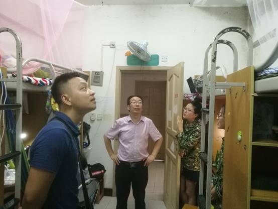 根据我校2017年7月7日安全稳定工作的会议要求和学生处关于在全校范围内开展学生寝室不规范用电行为等安全隐患排查的工作布置,2017年7月13日上午10点30分,我院分党委叶海林副书记带领辅导员游薇、樊少华、向丹丹、邓艺、郑娴老师,来到北四、北十二、北二十二、南三、南八、南九等学生公寓楼栋,排查我院学生寝室中存在的不规范用电等存在安全隐患的行为。
