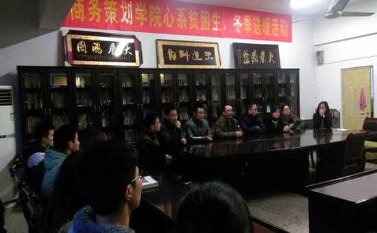 为使广大家庭经济困难学生度过一个温暖的冬天,让广大寒门学子感受商策大家庭的温暖。2015年12月21日,重庆工商大学商务策划学院组织并开展了“心系贫困生冬日送温暖”活动,党总支书记邓德敏、副书记叶海林以及全体辅导员(古纯玉、封海粟、游薇、樊少华、向丹丹、邓艺、禹洋春等)参加了此次活动。党总支书记邓德敏在为受助同学们发放棉被之余,与同学们亲切交流,询问同学们的学习及生活情况,并表示学院会一如既往的关心困难学生,帮助各类困难学生,希望同学们珍惜眼前的学习环境和学习机会,好好利用大学这四年的机会,学有所成。党总支副书记叶海林对受助的贫困生表示亲切的关怀,并希望他们平安健康,抓紧学习,期末考出好成绩,不断奋发成才,并常怀感恩之心,报效国家和人民,回馈社会与亲人。