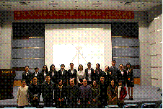 2015年12月18日下午15:00,“五斗米杯”商策讲坛之十佳“品学兼优”示范生讲坛在重庆工商大学主校区博智楼7100举行。本次讲坛邀请了“五斗米”集团董事长王顺海先生、首席高级咨询顾问袁靖杰先生、总经理罗开林先生和商务策划学院院长骆东奇教授、副院长王燕教授、党总支叶海林副书记为本次活动嘉宾,评委由学团办负责人古纯玉老师、分团委书记封海粟老师、樊少华老师、游薇老师、向丹丹老师、禹洋春老师、邓艺老师担任。学院2012、2013、2014级智育成绩和综合成绩都是第一的12名优秀同学,2013、2014级各班学生参加了本次讲坛。