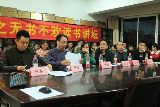 2015年12月16日下午18:30,商策讲坛之“无书不欢”读书讲坛在明德楼4020会议室举办。讲坛现场座无虚席,气氛热烈。此次讲坛邀请到学院党总支书记邓德敏、院长骆东奇担任本次活动嘉宾,评委由学院党总支副书记叶海林、学团办负责人古纯玉、分团委书记封海粟担任。20名读书讲坛参赛选手、院分团委学生会主席团代表、2014级和2015级各班读者代表,共同参与本次讲坛。讲坛主持人为学进会主任张志彬同学和综合协调部部长石慧巧同学。