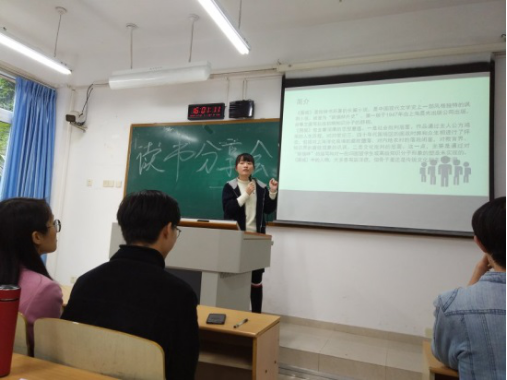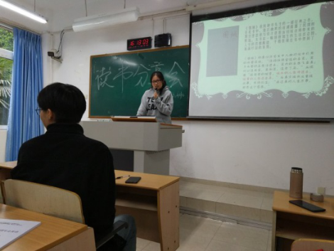 第二位分享者孙杨妹分享的书目是《围城》:内容围绕主人公方渐鸿展开,人生历程,到底是平坦的多还是崎岖的多;鲜明的人物形象,终究逃不过围城的阻挠,不论是婚姻、工作、人生还是自身,都是围城,我们能做的就是把握围城做好自己。
