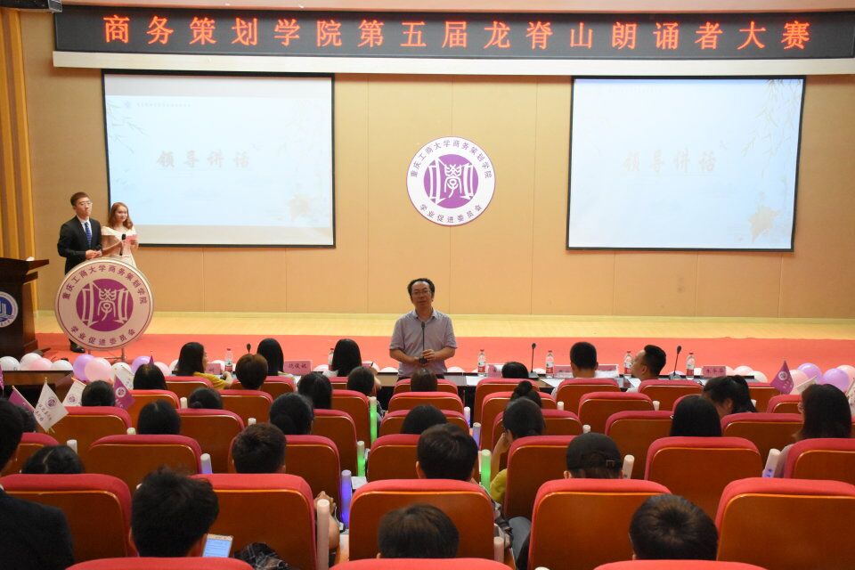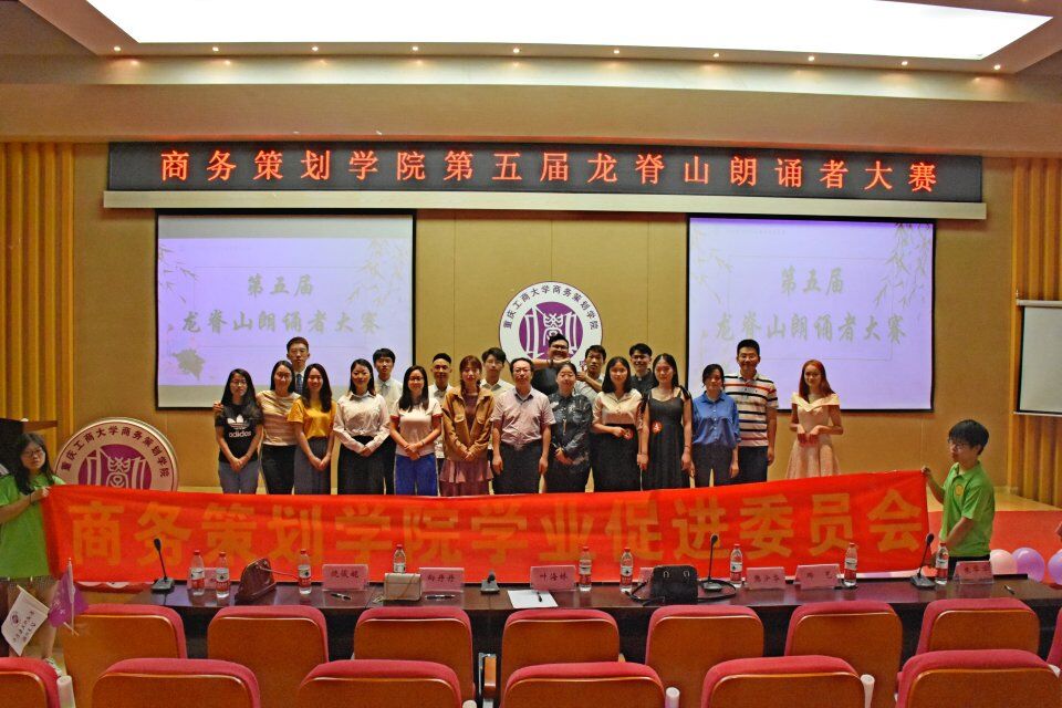 2019年5月27日晚上18:30,由重庆工商大学商务策划学院学业促进委员会主办的第五届龙脊山朗诵者大赛在南岸校区田家炳书院209报告厅如期举行。参加此次活动的领导有重庆工商大学商务策划学院分党委副书记叶海林,辅导员老师古纯玉、向丹丹、樊少华、邓艺、朱华华、郑娴、饶俊妮,同时积极参与此次活动的还有朝气蓬勃的17级商策学子。