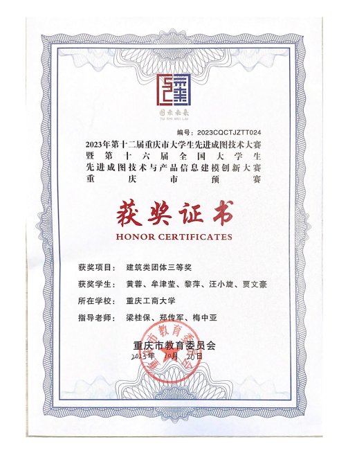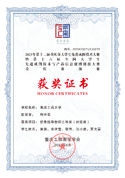 2023年5月26日至27日,第十六届全国大学生先进成图技术与产品信息建模创新大赛(以下简称“成图大赛”)重庆市预赛暨第十二届重庆市大学生先进成图大赛在重庆建筑工程职业学院举行。重庆工商大学太阳成tyc7111cc工程管理系梁桂保副教授、郑传军博士、梅中亚博士带领7名工程管理本科生在本次大赛中荣获建筑类团体三等奖。