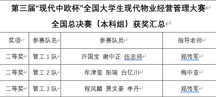 在现代物业大赛中,我校荣获(本科组)二等奖3项。在现代房地产大赛中,我校斩获(本科组)二等奖3项。