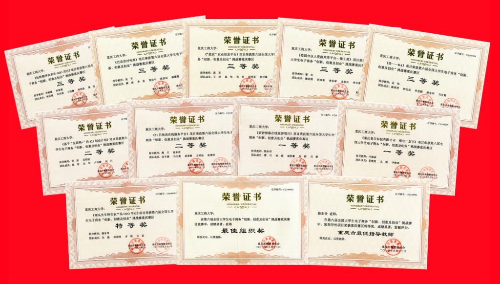 在此之前的第六届大学生电子商务“创新、创意及创业”挑战赛重庆赛区竞赛中,我校10支参赛团队共夺得1个特等奖、2个一等奖、2个二等奖和5个三等奖。我校作为第六届大学生电子商务“创新、创意及创业”挑战赛校内选拔赛的组织单位获得重庆市教委授予的最佳组织奖。