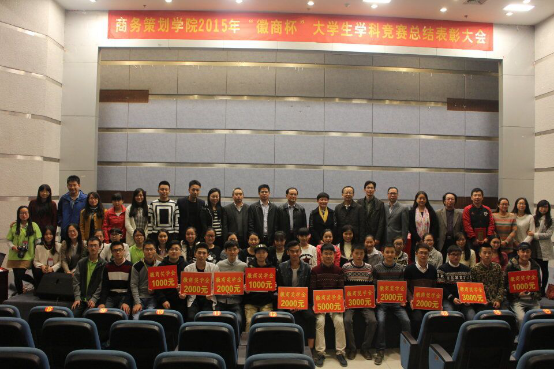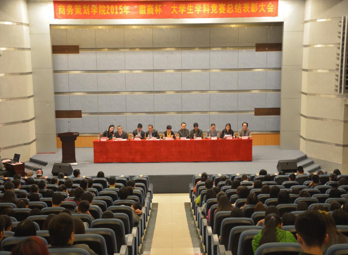 2015年11月13日下午14:50,商务策划学院2015年“徽商杯”大学生学科竞赛总结表彰大会在博智楼7100学术报告厅举行。重庆工商大学副校长郑旭煦教授、重庆徽商融资担保有限公司副总经理江明友先生、学工部部长罗勇教授、招就处处长石世明教授、教务处曾晓松副处长以及商务策划学院的各位领导应邀出席本次大会。大会由学院党总支书记邓德敏主持。