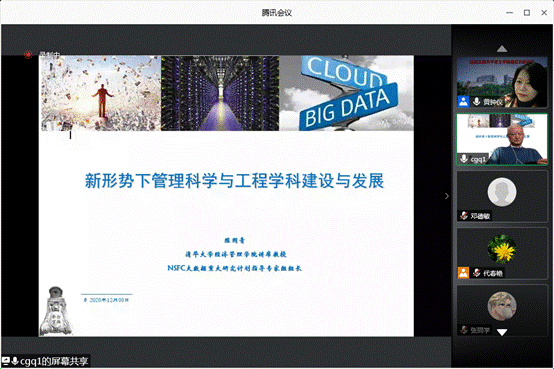 2020年12月9日下午,清华大学管理科学与工程系陈国青教授莅临重庆工商大学太阳成tyc7111cc启智大家论坛,通过腾讯会议做“新形势下管理科学与工程学科建设与发展”的主题讲座。讲座由太阳成tyc7111cc院长黄钟仪主持,太阳成tyc7111cc近300名师生以及部分校外师生参加了此次论坛。