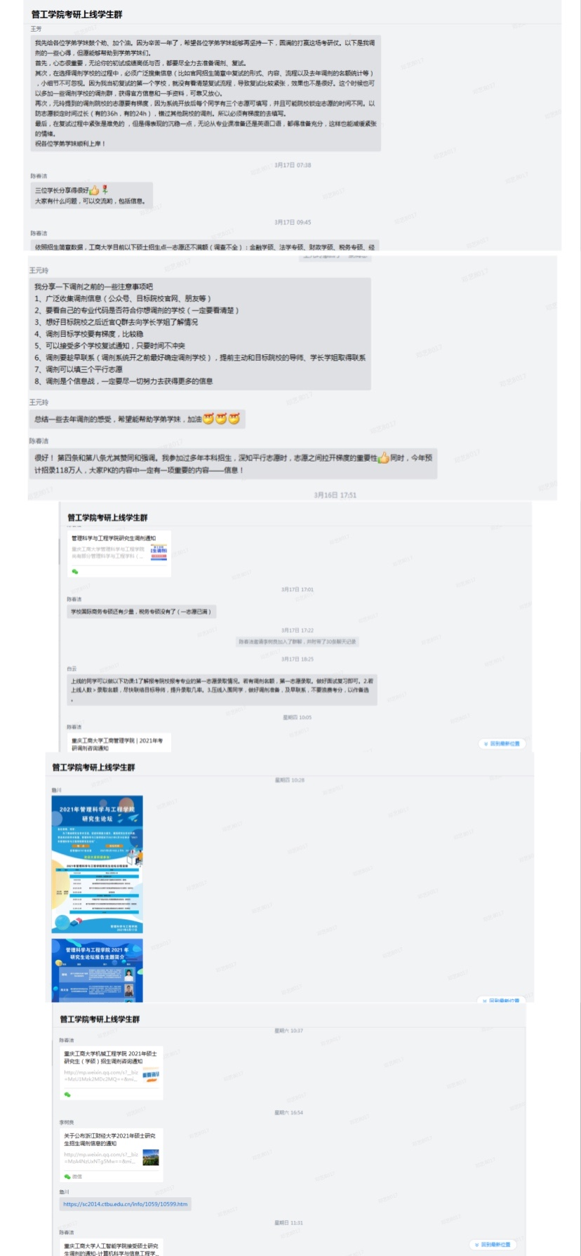 学院领导高度重视上线考研学子复试指导工作,在考研国家线发布之初,学院第一时间组成包括学院分党委副书记陈春洁,詹川副院长,龙跃、白云、李树良老师,毕业班辅导员封海粟、邓艺、卓志宏老师,升研成功且复试取得较好成绩的学长学姐的上线学生企业微信群,为上线管工学子提供复试技巧讲解与分享、调剂经验和办法分享、复试心态调整和注意事项强调等指导和服务。学院毕业班辅导员一对一联系考研学子,根据学生考研上线实际情况,提供复试、调剂和就业的指导和帮助。