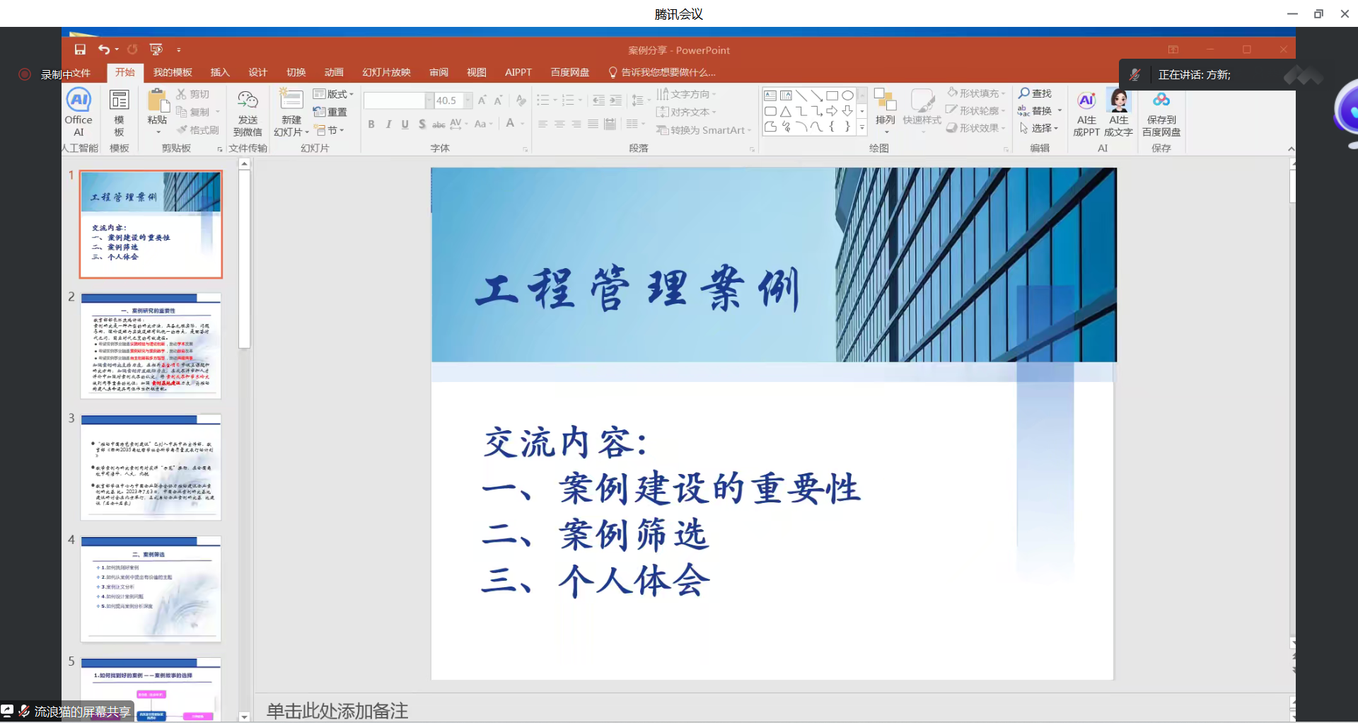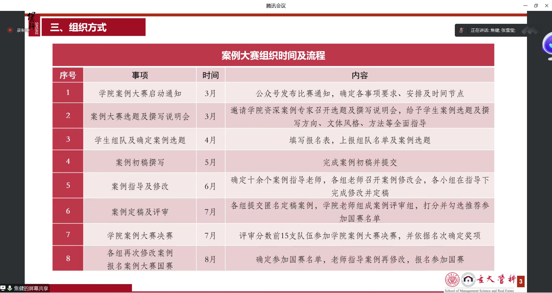 会议分为三个部分。首先由重庆大学MEM中心招生和学工主管焦健老师分享中国工程管理案例参赛组织与管理。焦老师从组织目的、历届情况和组织方式三个方面进行介绍。明确的组织目的有助于学生培养、案例培育和案例教学提升。接着焦老师展示了重庆大学历届参赛情况,并详细分享了每个自然月重庆大学推动中国工程管理案例大赛的组织安排,包括从参赛师生队伍的组建到案例的选题,再到初稿撰写以及定稿评审后上报国赛,每一个步骤都做出细致安排。