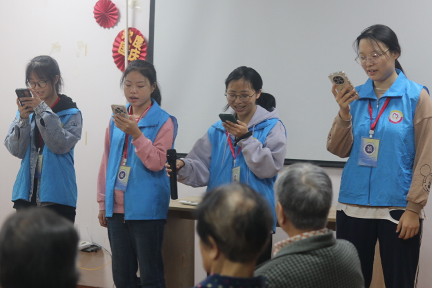 活动伊始,志愿者们通过在舞台上表演合唱歌曲《最炫民族风》活跃了现场氛围,为老人们带来欢乐。台下的志愿者们陪伴在老人身边,与他们交谈,倾听过往的事迹。合唱《没有共产党就没有新中国》《感恩的心》等歌曲唤起了老人们对过去岁月的回忆,也让志愿者们深刻体会到了历史的厚重和过往的不易。