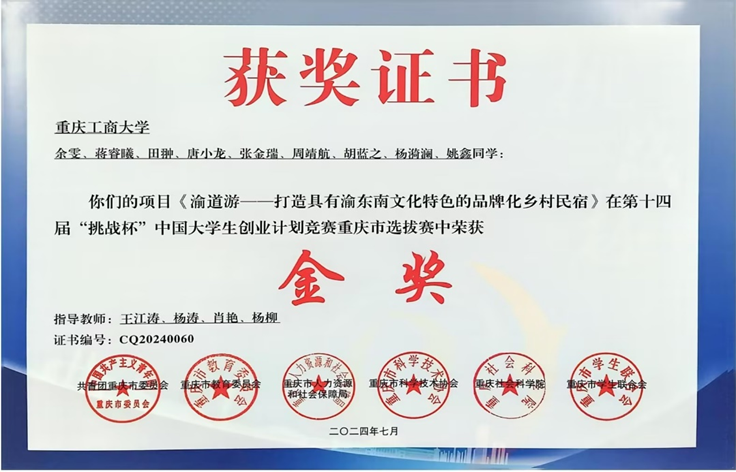 近日,第十四届“挑战杯”中国大学生创业计划竞赛圆满落幕,由余雯、蒋睿曦、田翀、唐小龙、张金瑞、周靖航、故蓝之、杨漪澜、姚鑫同学组成的团队,在重庆市选拔赛中斩获金奖,学院在重庆工商大学第十四届“挑战杯”中国大学生创业计划竞赛中荣获优秀组织奖。