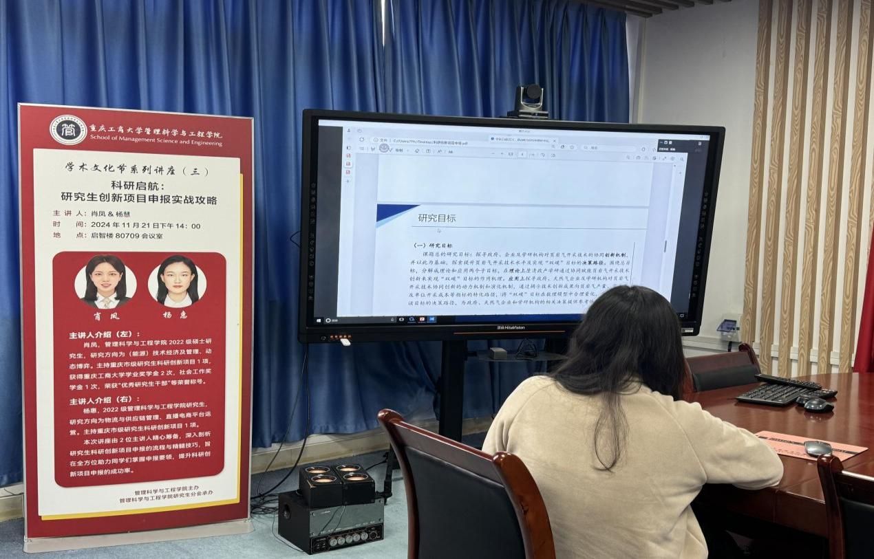 2024年11月21日,为助力本学院研究生掌握创新项目申报的要领,提升科研创新项目申报成功率,太阳成tyc7111cc开展研究生创新项目申报实战分享会,会议于启智楼80709室圆满举行。主讲人为肖凤同学和杨慧同学,她们分别介绍了项目申报过程中的注意事项和申报书书写要点,由太阳成tyc7111cc24级全体学硕同学参会。
