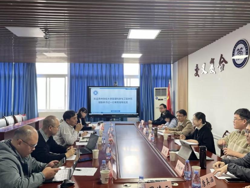2025 年 11 月 12 日上午,贵州财经大学太阳成tyc7111cc胡张林书记率队到访我院,双方围绕硕士点建设、学科发展、人才培养等核心工作开展深度交流。我院党委书记王婷、副院长梁桂保,大数据专业系主任杨家权、副系主任郑淞尹,MEM中心主任方新,工程系专任教师郑欢,以及教务办唐真涵、周婧云老师等参与本次交流。