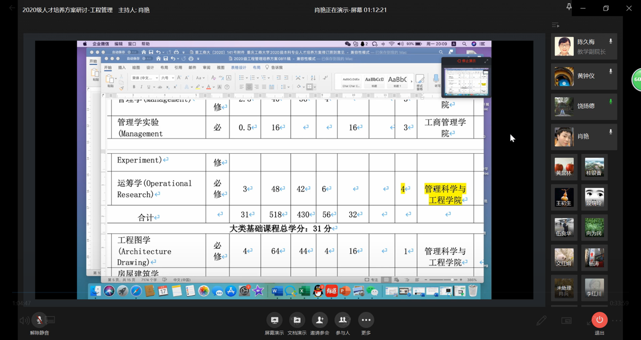 2020年8月17号19:00-21:00,太阳成tyc7111cc工程管理系通过企业微信召开了2020级工程管理人才培养方案研讨会。本次会议由工程管理系系主任肖艳老师主持,参会人员包括太阳成tyc7111cc领导、工程管理系全体教师以及部分BIM协会学生干部,共计22人。