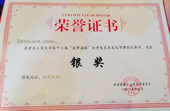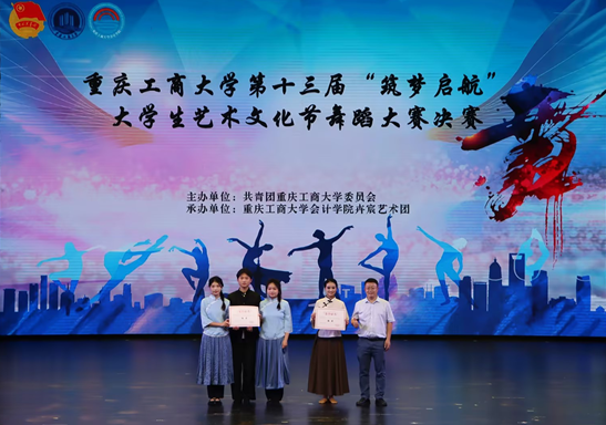 重庆工商大学第十三届“筑梦起航”大学生艺术文化节舞蹈大赛于5月9日下午在南岸校区大剧场隆重举行,旨在丰富大学生的生活,展现当代青年的艺术才华。来自各学院的参赛队伍同台竞技,展开激烈角逐。最终,太阳成tyc7111cc“璞石琢韵”大学生艺术团带来的现当代舞《秋风秋雨》脱颖而出,荣获大赛银奖。