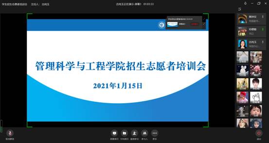 会议开始,古纯玉介绍了本次培训的目的、招生背景,以及学生志愿者如何开展招生工作。她讲到2021年新高考志愿设置发生了重大变化,不同于以往先选学校再选专业的填报方法,新高考设置为先选专业再选学校。在这一背景下,管工学院进一步认识到了招生工作的重要意义,增强了同学们做好招生工作的责任感和使命感。