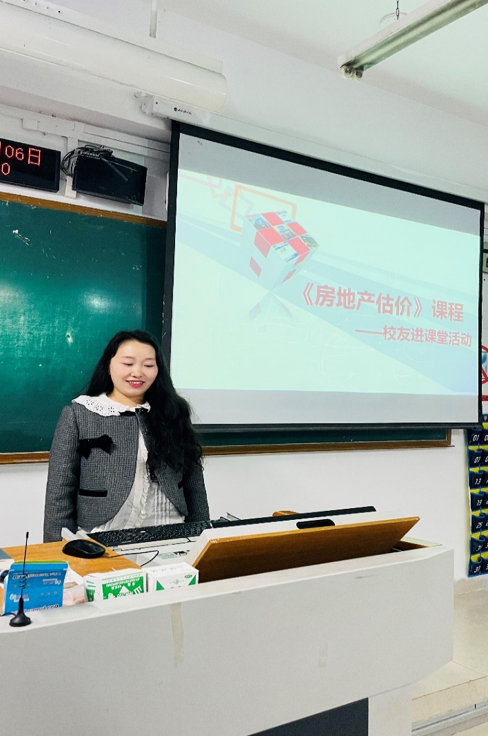 活动开始,蒋代平校友首先感谢了肖艳老师与梁桂保老师的邀请,并对自己及公司的基本情况进行了介绍。随后,她向同学们讲述了房地产估价的含义、要素、必要性以及对房地产估价的基本认识,强调“房地产估价是科学与艺术的有机结合”。