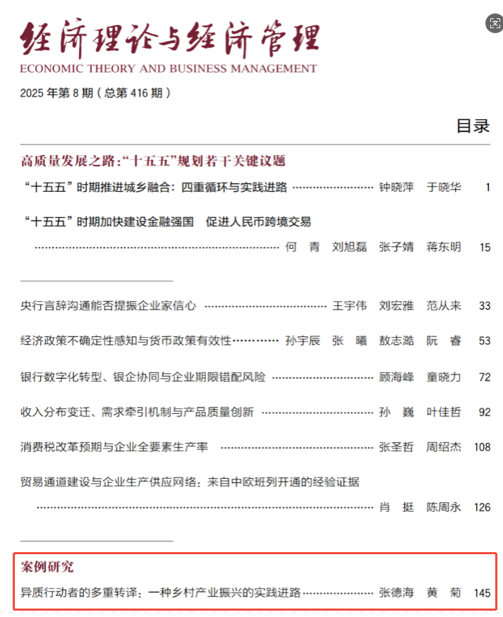 我院张德海教授以第一作者身份,在《经济理论与经济管理》(社科基金资助期刊)发表题为《异质行动者的多重转译:一种乡村产业振兴的实践进路》的研究论文。论文第二作者和通讯作者为重庆工商大学重庆现代商贸物流与供应链协同创新中心黄菊副教授。