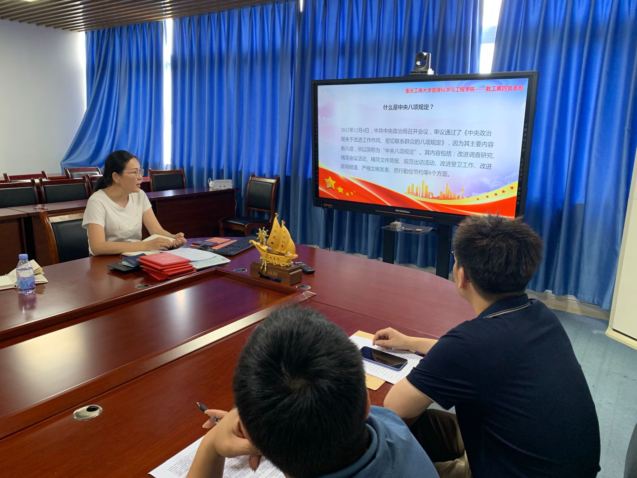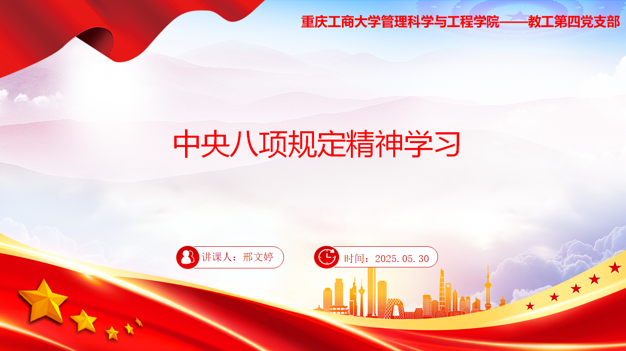 随后,邢文婷同志对《中央八项规定精神》的具体内容进行了逐条解读。从改进调查研究,到精简会议活动、精简文件简报;从规范出访活动,到改进警卫工作、改进新闻报道;再到严格文稿发表、厉行勤俭节约,每一项规定都紧密围绕着密切联系群众、改进工作作风展开。在解读过程中,她结合高校实际情况,列举了一些容易出现问题的场景。比如,在调查研究方面,强调要避免 “走过场” 式调研,真正深入教学一线、科研团队,了解师生的实际需求和困难;在会议活动上,提醒党员干部要杜绝 “文山会海”,提高会议效率,注重会议实效;在勤俭节约方面,指出高校应在实验室耗材使用、办公设备采购等环节严格把控,杜绝浪费现象。